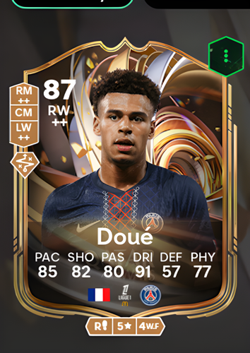 Désiré Doué’s Ratings Reload card showcases him as a dynamic Right Wing with an impressive overall rating of 87, making him a standout option for any squad. This card boasts exceptional dribbling at 91, rapid pace at 85, and solid shooting at 82, ensuring Doué can slice through defenses and capitalize on scoring opportunities. With passing rated at 80, he can set up teammates effectively, while his physicality at 77 adds resilience in duels. As a sharp attacking winger, Doué’s blend of speed, skill, and finishing ability makes him the perfect weapon to break down opposition lines and deliver match-winning moments.